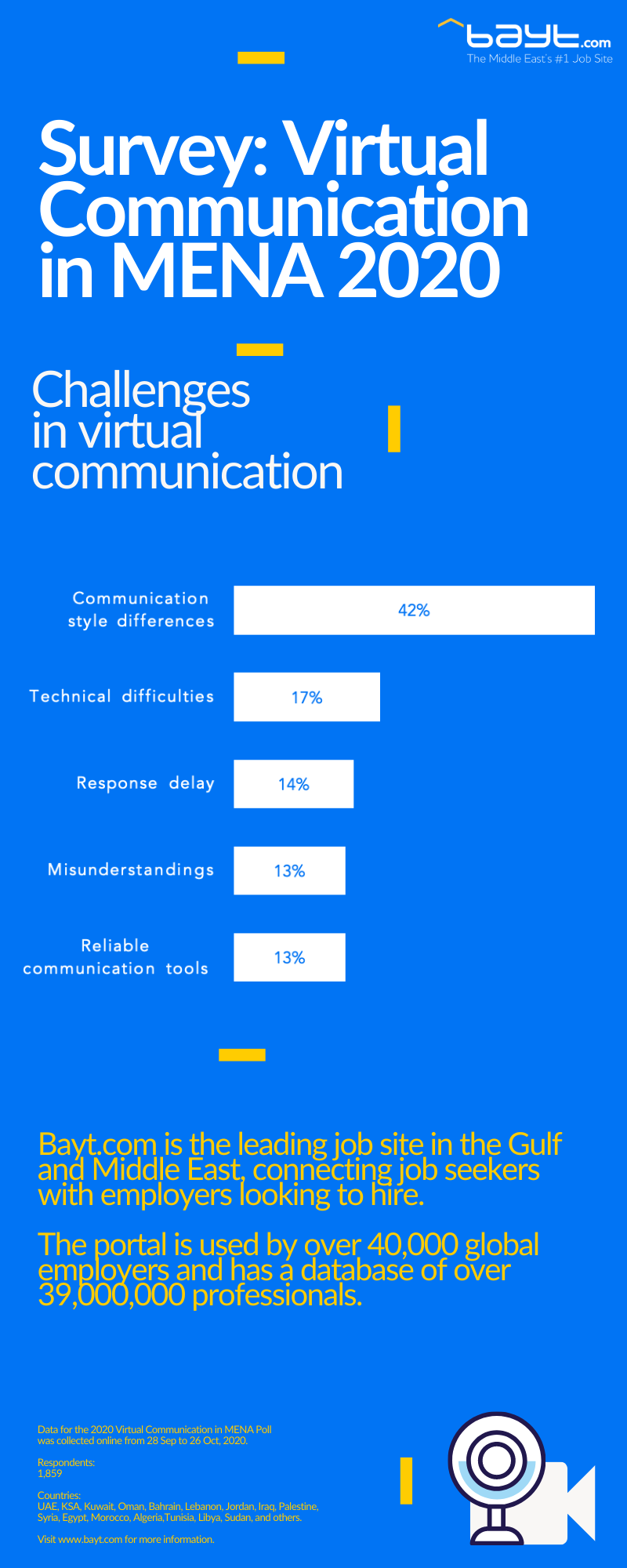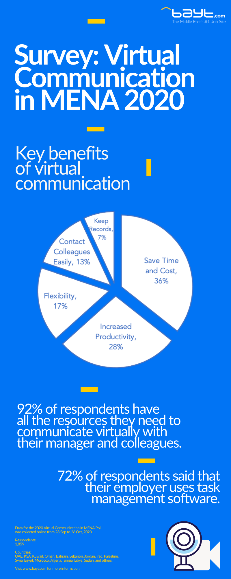 Bayt.com has recently conducted the Virtual Communication survey to highlight the region’s current techniques and tools that are used to facilitate work during challenging times. With a comprehensive overview of the virtual communication process, companies can better understand what works and how the process can be improved. Likewise, employees can identify what tools are available for them.