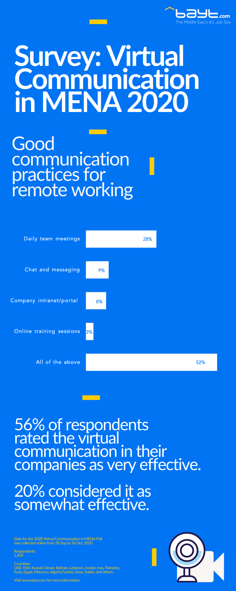 During recent months, there has been a shift from working in an office environment to working remotely. Therefore, good communication practices have become vital to the success of a remote team. Are MENA professionals satisfied with the virtual communication effectiveness in their company? What are the key methods of communicating with potential employers nowadays? What about the benefits and challenges associated with virtual communication?
